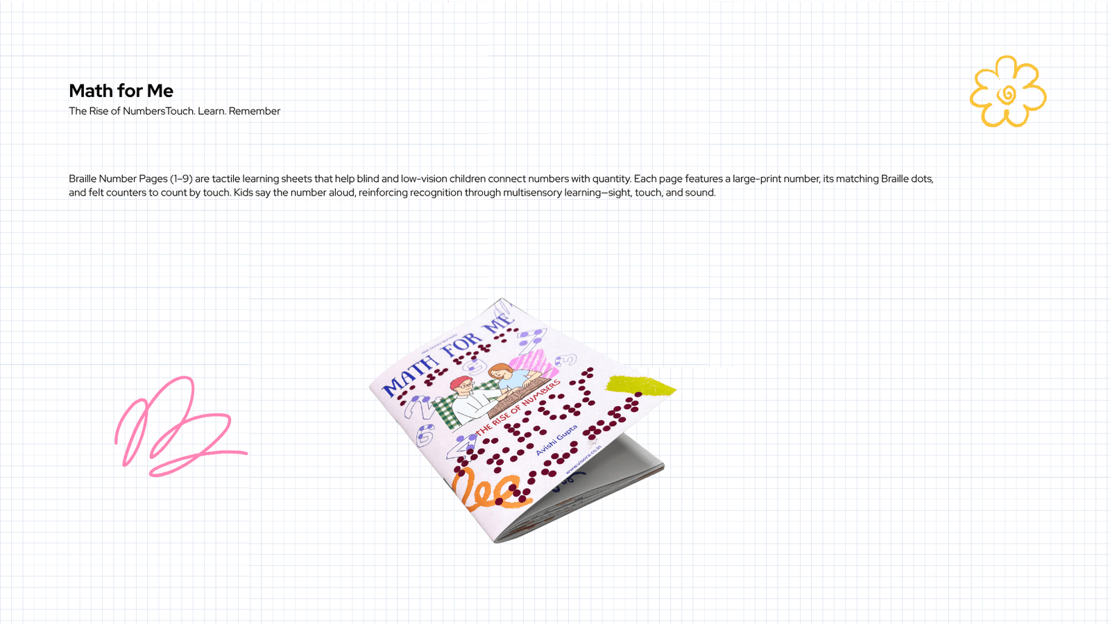 Braille Number Pages (1–9) are tactile learning sheets that help blind and low-vision children connect numbers with quantity. Each page features a large-print number, its matching Braille dots, and felt counters to count by touch. Kids say the number aloud, reinforcing recognition through multisensory learning—sight, touch, and sound.