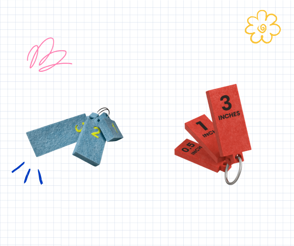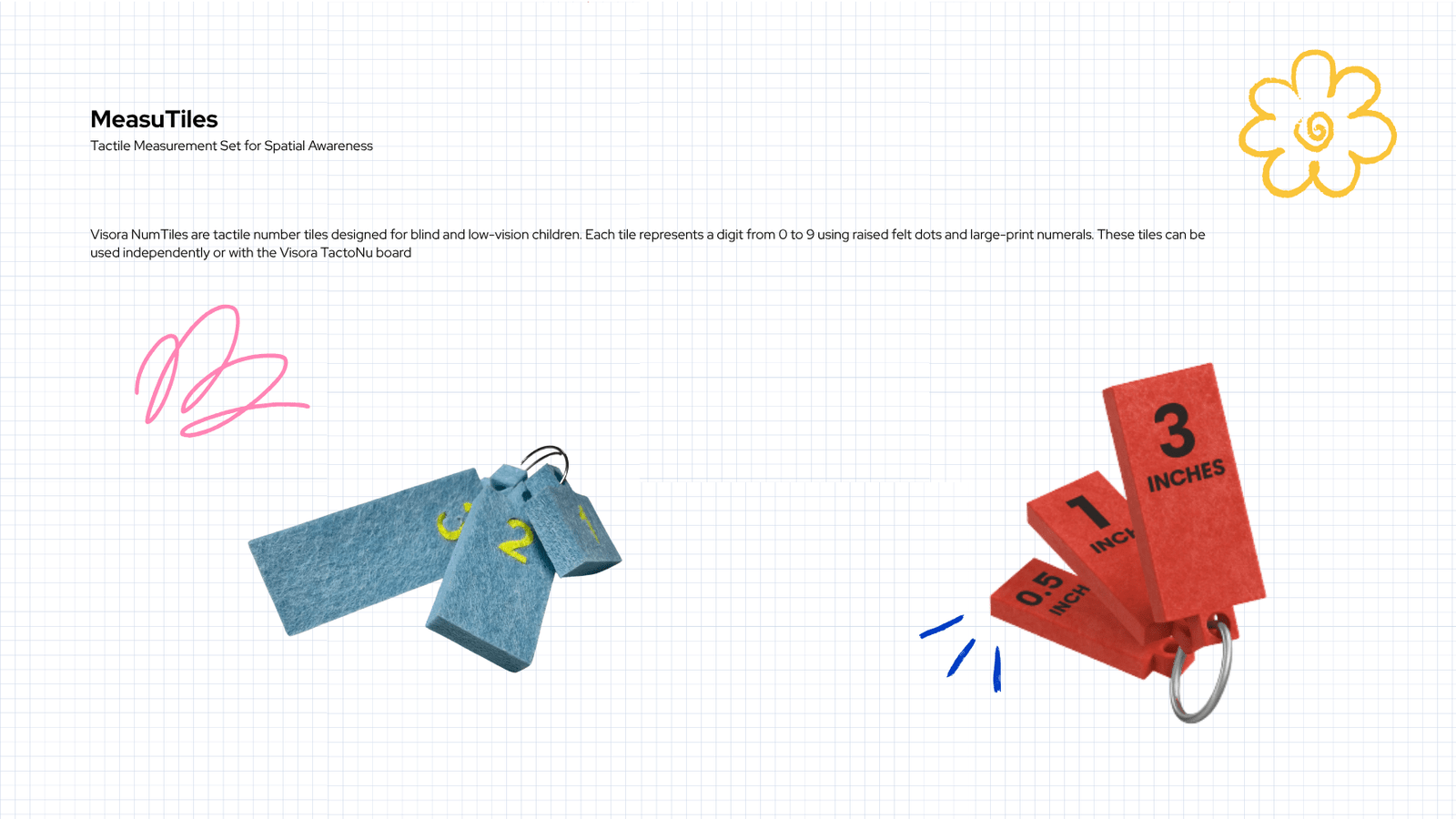 MeasuTiles are tactile felt tiles that help blind and low-vision children grasp measurement concepts through touch. Each precision-cut tile represents a unit (0.5″, 1″, 2″, 3″, etc.) and allows kids to explore length, size comparison, and estimation. Linked by a sturdy metal ring, they’re portable, durable, and classroom-friendly.