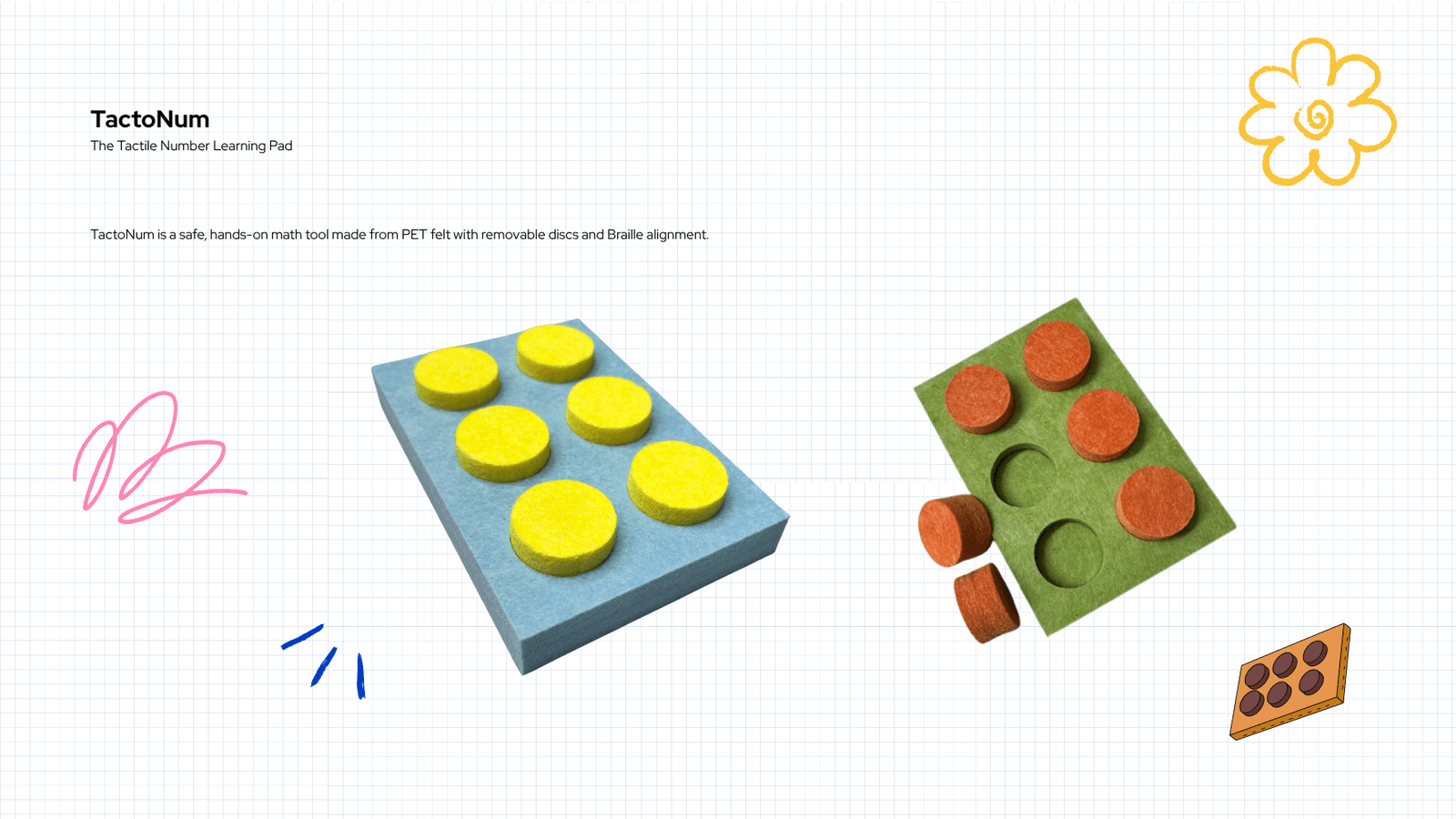 TactoNum is a safe, hands-on math tool made from PET felt with removable discs and Braille alignment.